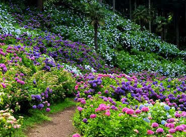 総面積27,000㎡の屋敷に18,000㎡、250品種・10,000株以上のあじさいが色彩豊かに咲き競います