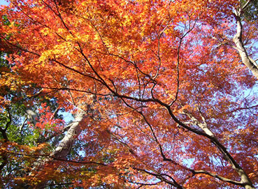 渋谷の伊弉子(いさご)神社境内では大きな山モミジがみれるよ。この樹はイロハモミジ(別称:タカオカエデ)で、その特徴は葉が5?7指に深裂し、新枝の枝の先に径3?6cmの散房状の花房をつける。