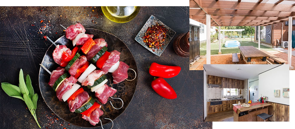 調味料を完備したキッチンでは、畑で採れた野菜や地元産の新鮮な食材を使った料理を楽しめます。また、屋根付きBBQ場では時間を気にせず、ゆっくりと食を楽しむことが可能です。食べたい食品を食べたい味で食べたいだけ堪能する。そんな贅沢なお食事をお楽しみください。