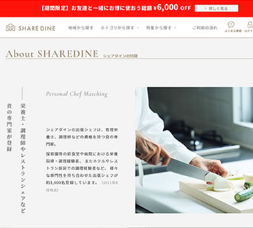 シェアダインの出張シェフは、管理栄養士、調理師などの資格を持つ食の専門家。保育園等の給食室や病院における栄養指導・調理経験者、 またホテルやレストラン厨房での調理経験者など、 様々な専門性を持ち合わせた出張シェフが約1,600名登録しています。