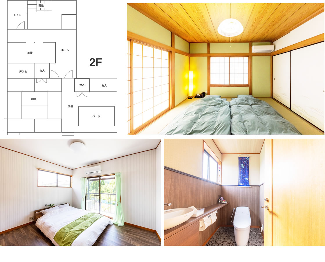 - 和室3部屋 洋室1室 LD1室 ダブルベッド1 敷布団5